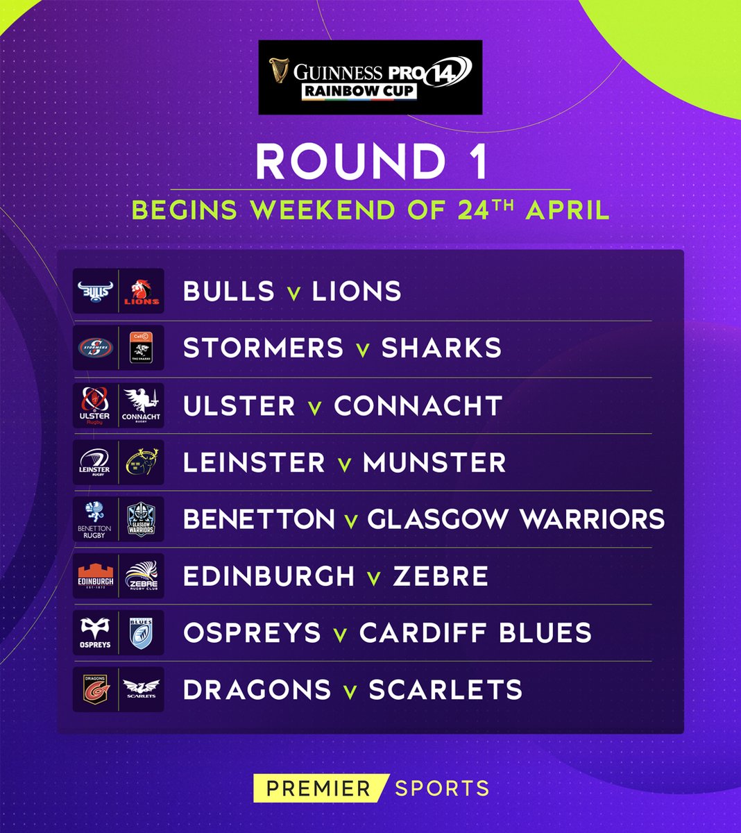 Benetton v Glasgow Warriors. The Warrior Nation will then have five more fixtures two home and three away. Find Guinness Pro14 20202021 schedule Guinness Pro14 20202021 fixtures next matches and all of the current seasons Guinness Pro14 20202021 schedule. Fixtures confirmed for conclusion of Pro14 29 games will take place in the final four rounds between 19 February and 22 March. 24 April 2021 Vodacom Bulls v Emirates Lions DHL Stormers v Cell C Sharks Ulster v Connacht Leinster v Munster Benetton v Glasgow Warriors Edinburgh v Zebre Rugby Club Ospreys v Cardiff Blues.